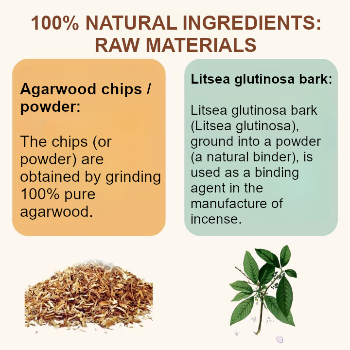 The composition is based on powder made from 100% pure agarwood, selected from a maturation range of 8 to 12 years. The spiral structure is held together using a natural plant binder derived from powdered litsea glutinosa bark. No synthetic fragrance is added to enhance the scent. The aroma therefore remains natural, light, and true to the wood itself.